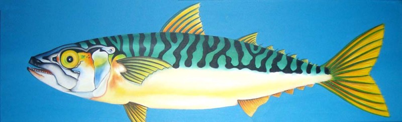 MATERIAL: Öl auf Leinwand MASSE: 5 Keilrahmen, 30 x 100 cm Lippfisch, Hecht, Rotbarsch, Seeskorpion, Makrele 5 BILDER: 1500 €